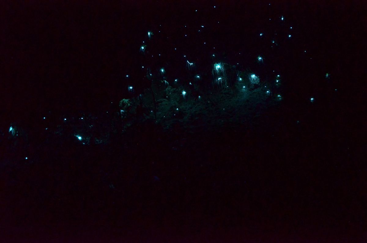 Abends wählten wir dann einen Weg, der bekannt ist für seine vielen ‚Gloworms‘ in der Nacht. Bei den Glowworms handelt es sich jedoch nicht um Glühwürmchen in der Art wie wir sie in Deutschland kennen. Sondern um tatsächliche kleine Würmer die zur Fliegenjagd einen Vorhang aus klebrigen Fäden produzieren und anschließend gut dahinter platziert, zu leuchten beginnen. Fliegt die Beute auf das Licht zu, wird sie in dem klebrigen Netz gefangen.