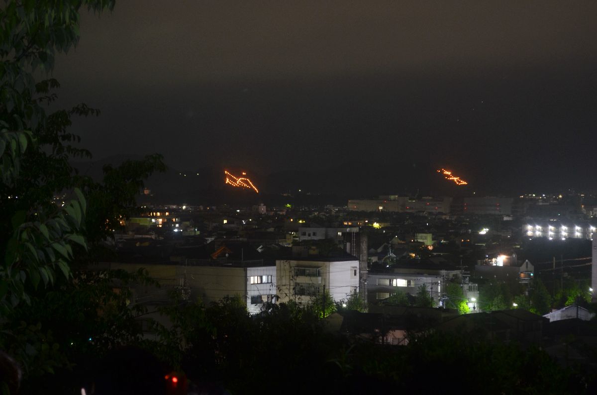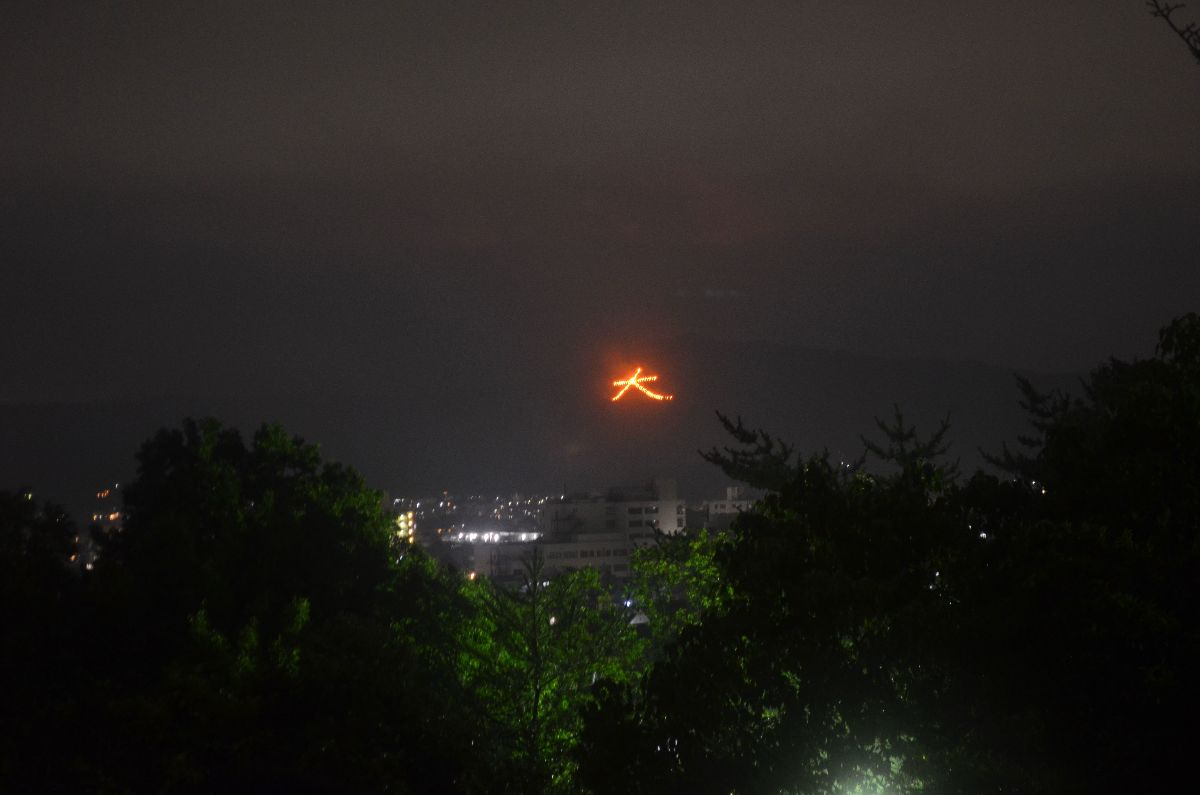 Diesmal passte daher zum Glück auch unser Timing und wir waren (sogar mit einen Puffer von ganzen 2 Minuten!) noch pünktlich zum Beginn des Daimonji Festivals (offiziell Gozan no Okuribi) auf der Spitze des Funaokayama (ein Hügel in der Innenstadt Kyotos) um zu sehen wie die Schriftzeichen angezündet wurden.