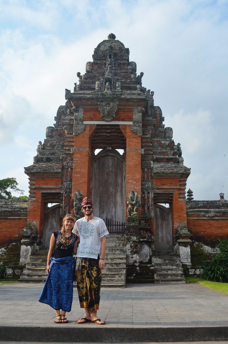 Will man einen Tempel besuchen benötigt man spezielle Kleidung. Diese besteht für Männer und Frauen aus langen und kurzen Sarong-Röcken ((Wickeltuch) und farbigen Schals (Selendang/Saput) als Gürtel. Dazu wird ein traditionelles Hemd oder ein langarmiger Überwurf (Kabaja) angezogen. Die Jungs bekommen auch noch ein Stecktuch mit dem Namen Udeng (Yannik steht total darauf).