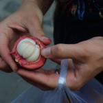 - Eine Mangostin – dicke fasrige Schale und flutschig, süßes Inneres
