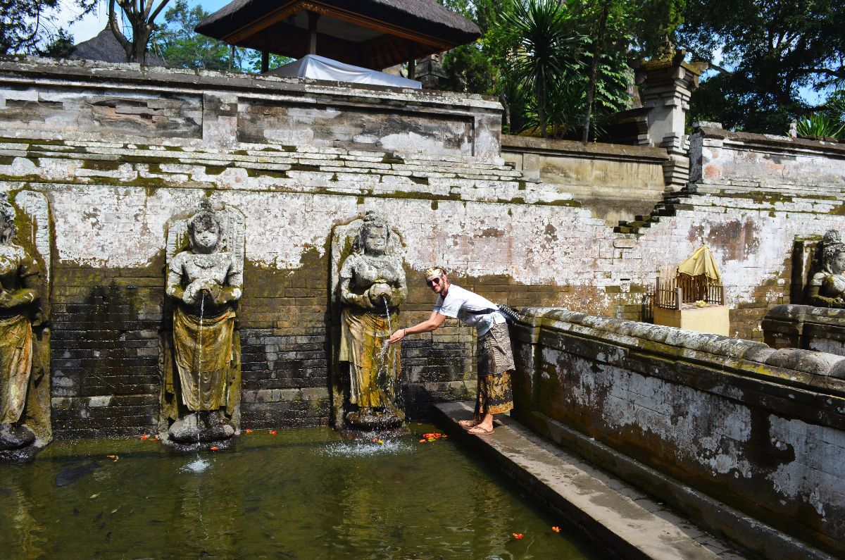 Die Geschichte der Goa Gajah (Elephant Cave) hat sich den Forschern noch nicht gänzlich erschlossen, doch Forschungen haben ergeben, dass sie vermutlich im frühen 11 Jahrhundert entstanden ist. Laut einer Legende ist dies durch die Fingenägel des Riesen Kebo Iwa geschehen (das wird hier irgendwie bei fast allen teinformationen behauptet). In den 1900rn wurde die Höhle von dänischen Forschern wiederentdeckt und Elefantenhöhle getauft, da sie den Höhleneingang in Form eines riesigen Dämonenmundes mit einem Elefanten verwechselten. Dabei kannten die wahren Erbauer vermutlich gar keine Elefanten, denn diese gab es damals gar nicht auf Bali. Die meisten der Plätze die wir heute besichtigen konnten, wurden erst im Zuge der Wiederentdeckung zurück ans Tageslicht befördert, wie beipielsweise die Becken zur rituellen Reinigung oder ein eingestürzter Tempelbau.