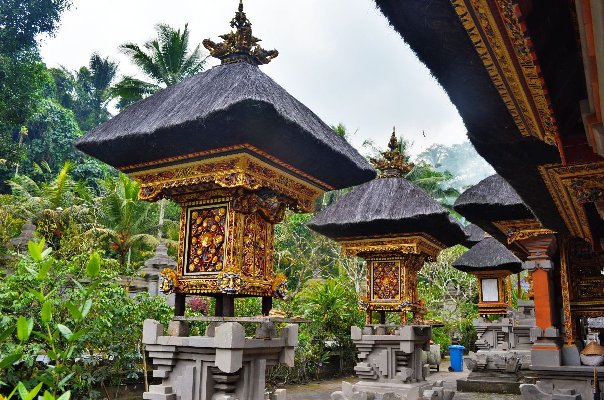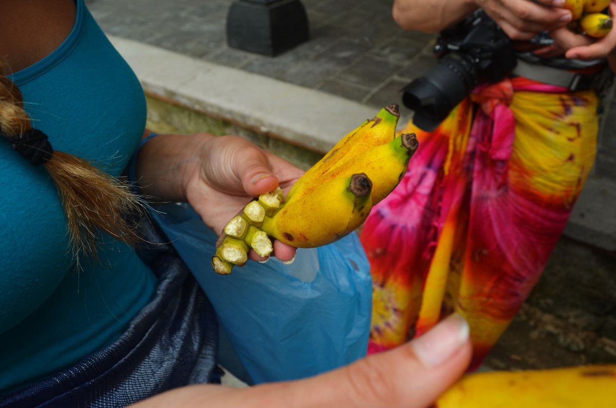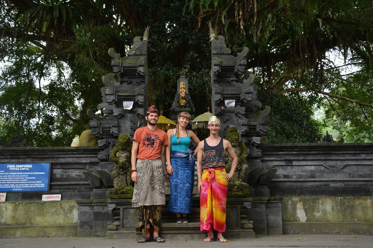 Da es beim letzten Mal so gut geklappt hat, wagten wir uns erneut mit den Rollern auf die chaotische balinesische Straße. Dieses Mal hatten wir den Besuch zweier Tempel im Sinn: den Pura Gunung Kawi (Rocky Temple) und den Pura Tirta Empul (Holy Spring Temple). Auf dem Gelände des Gunung Kawi findet man eine ganze Steinhöhlensiedlung sowie verschiedene Tempel die in zwei riesige Felswände auf beiden Seiten eines kleinen Flusses gehauen wurden. Der Legende nach wurden diese Tempel (wie ziemlich viel hier in der Gegend) durch die viel zu langen Fingenägel des Riesens Kebo Iwa geformt. Wer die Steintempel tatsächlich ausgehöhlt hat ist leider nicht bekannt, doch das Entstehungdatum liegt vermutlich in der Mitte des 10. Jahrunders. Besonders gut gefallen hat uns hier, dass viele Anlagen noch gut erhalten sind und sogar betreten werden können. Danach besichtigten wir den Tirta Empul Tempel. Der Name des Tempels bedeutet heilige Quelle (Tirta = heiliges Wasser, Empul = Quelle) und verrät daher schon was sich in seinem Zentrum befindet. Wir haben uns diesen Tempel ausgesucht, da er einer der ältesten (schon ca. 960 n. Chr.) und dennoch gut erhaltenen Tempel Balis ist. Von seiner heiligen Quelle aus führen verschiedene Wasserabläufe in große Reinigungsbecken. Wir waren etwas überrascht zu sehen, dass tatsächlich der ein oder andere Besucher in voller Tempelkleidung darin baden gegangen ist. Bei der Reinigung hat jeder Wasserstrahl eine spezielle Funktion, beispielsweise steht ein Strahl für die Reinigung des Geistes, ein anderer reinigt von dem Bösen und wieder ein anderer soll gut gegen Krankheiten sein. Da wir uns aber nicht sicher waren welcher was bewirkt waren wir selbst lieber nicht baden. Wollten ja nicht noch aus Versehen was falsches bewirken xD