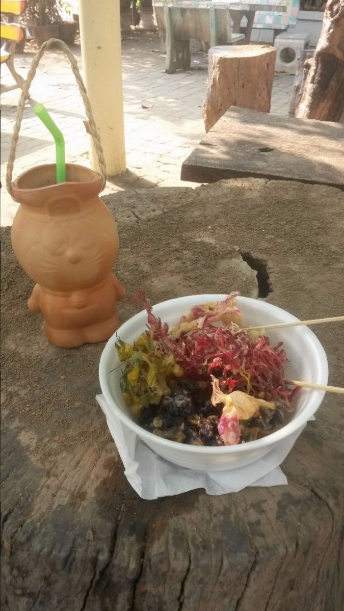 - Wir trinken aus Duraimon (Tonfigur) und essen frittierte Blumen – so lässt es sich leben :)