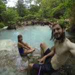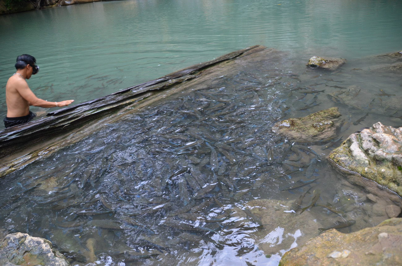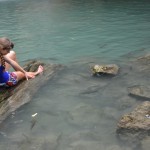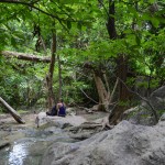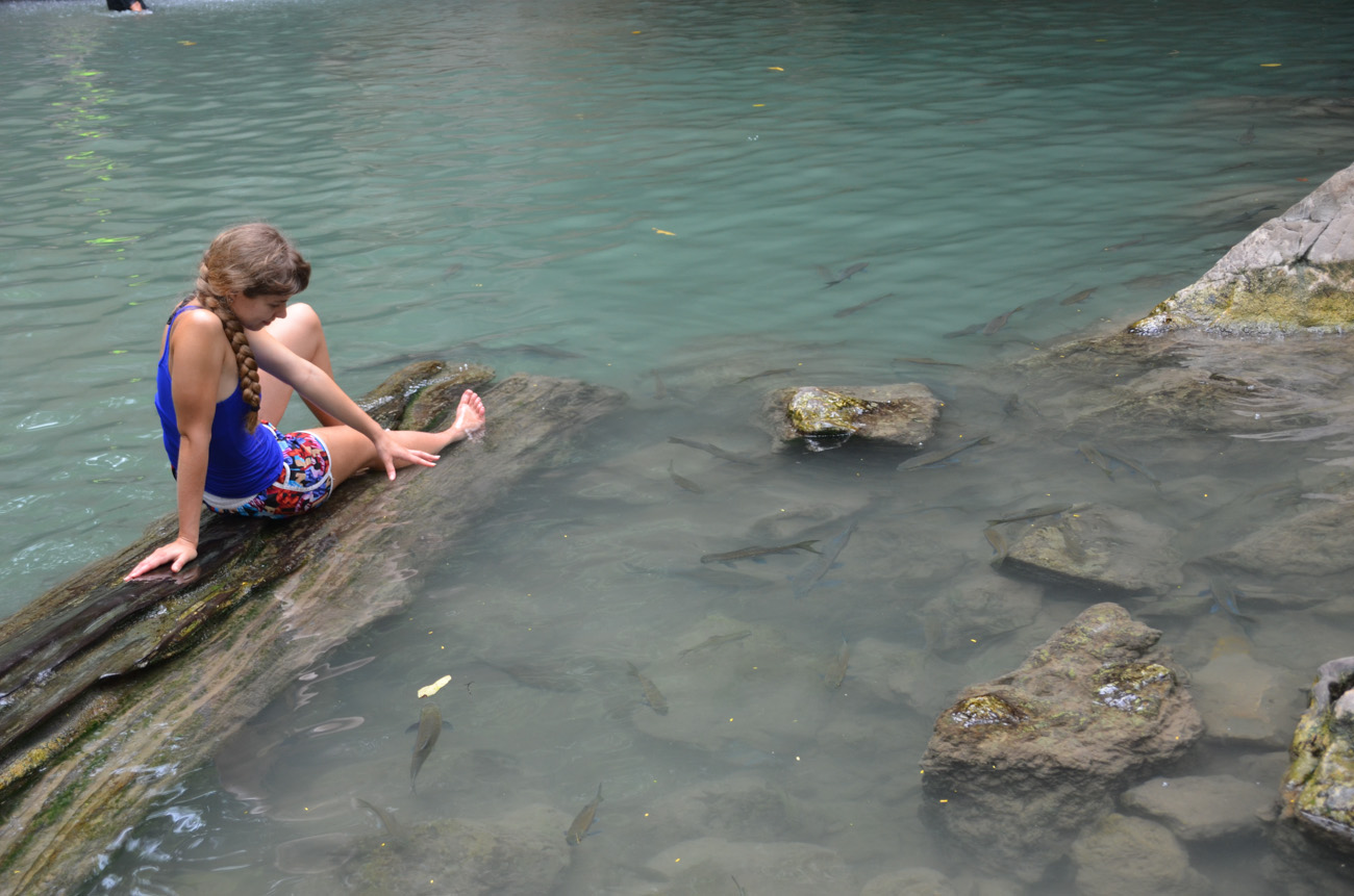 Zum Frühstücken gingen wir zur zweiten Stufe der Erawan Falls zurück. Dort hatten wir so früh morgens noch alles für uns alleine – nur den Pool mussten wir uns mit vielen großen und kleinen Fischen teilen.