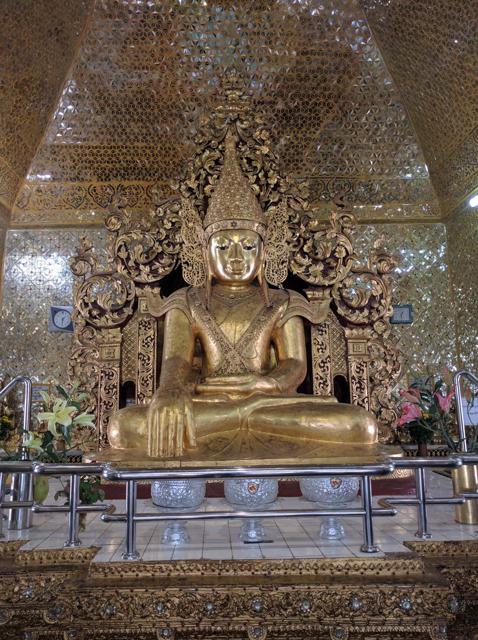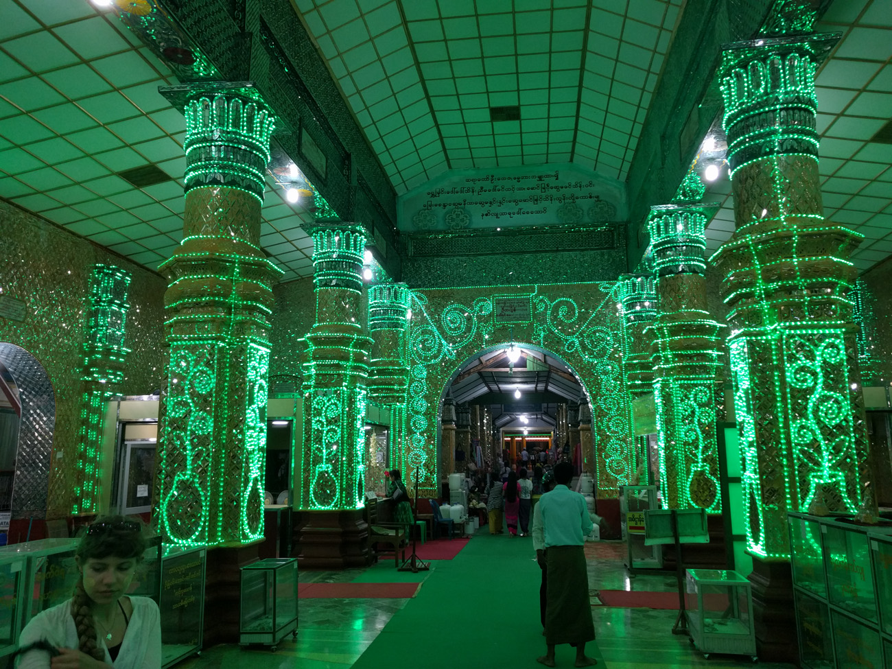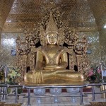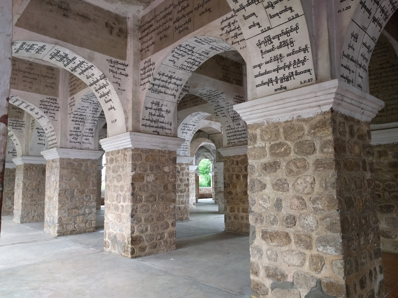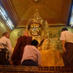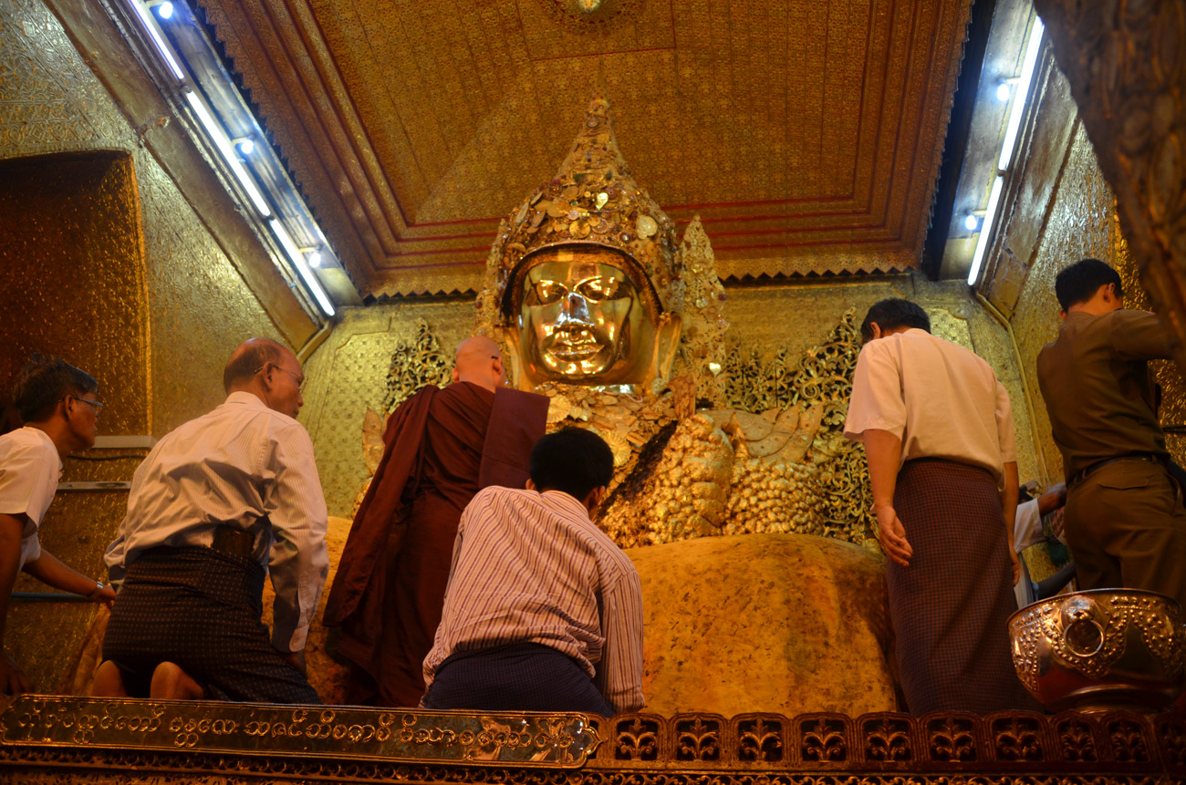 Wir besuchten sogar einige der Pagoden, wie z.B. die Mahumuni Pagode mit einer großen Buddhafigur, die tonnenweise mit Goldblättern beklebt wurde. Cool fanden wir auch die Pagodengruppe Kuthodaw (die sich auch ‚das größte Buch der Welt‘ nennt, da sie auf 729 Steinplatten die Geschichte Buddhas erzählt) und den Palast des ehemaligen Königs mit einem großen Wassergraben an dem sich abends alle Pärchen der Stadt zum Turteln zu treffen schienen. Die Leute aus Myanmar flirten glaub gerne ;)