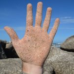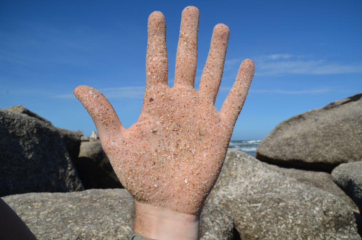 - Die vielen Muschelstückchen kleben an der nassen Haut